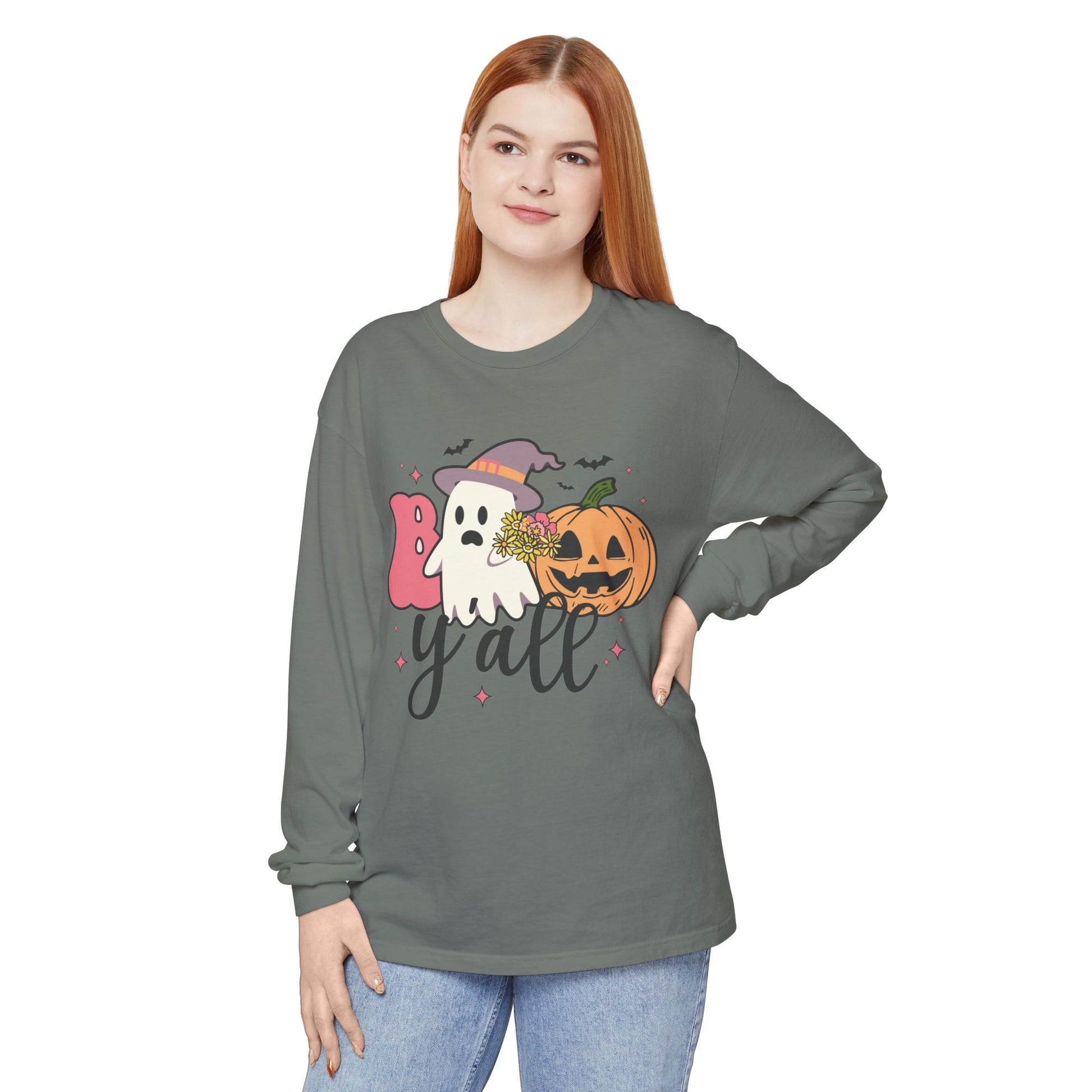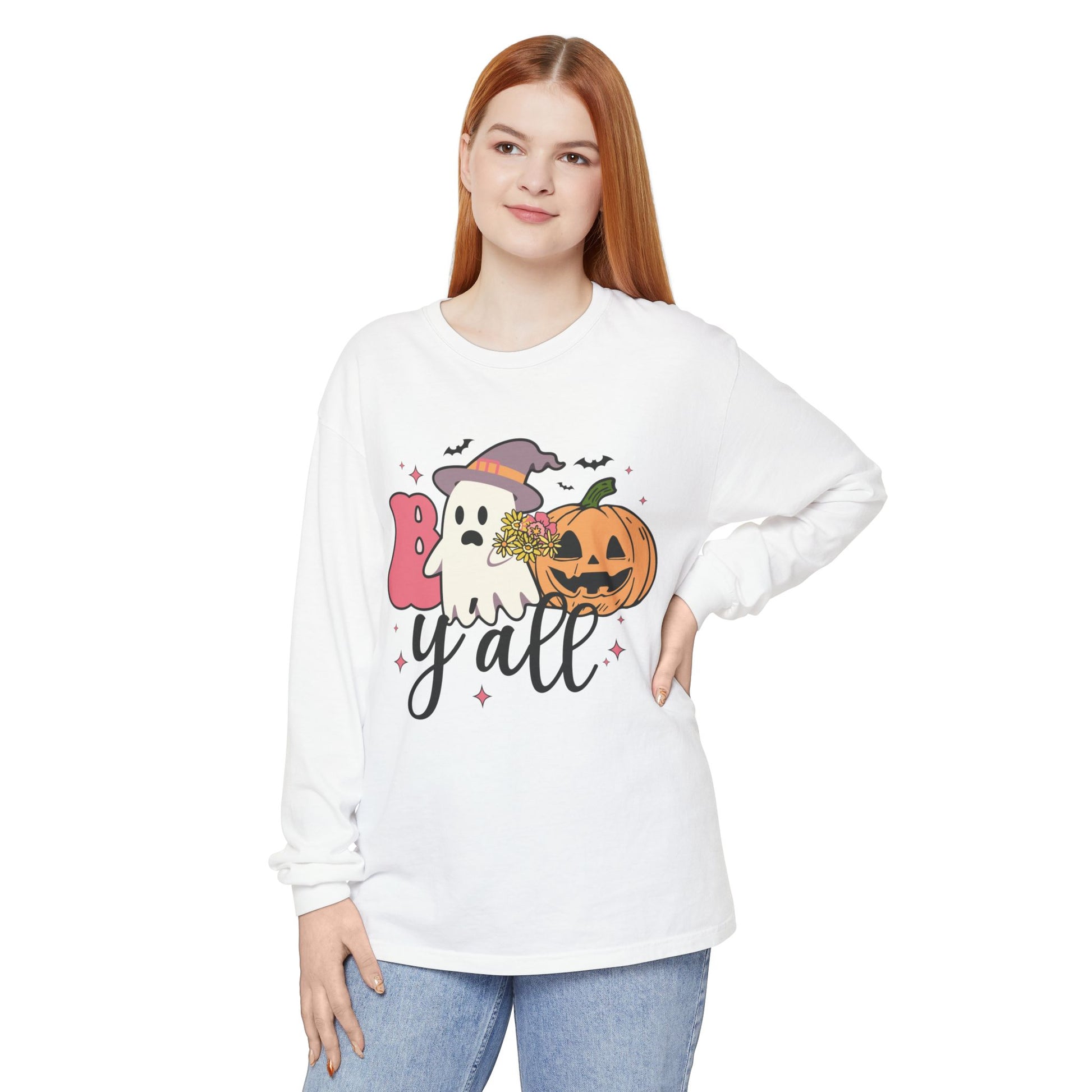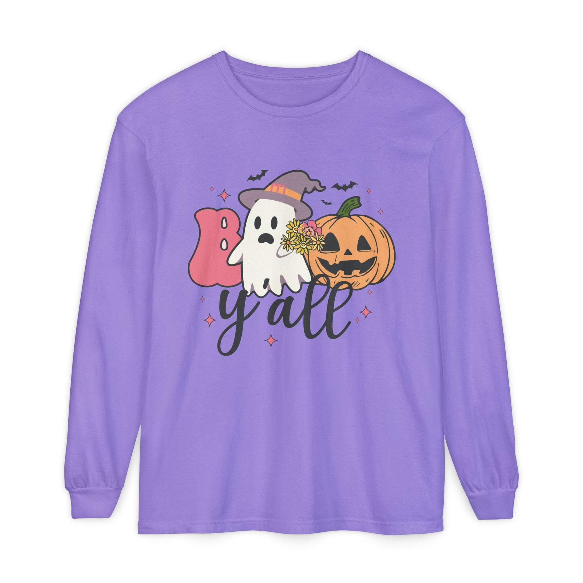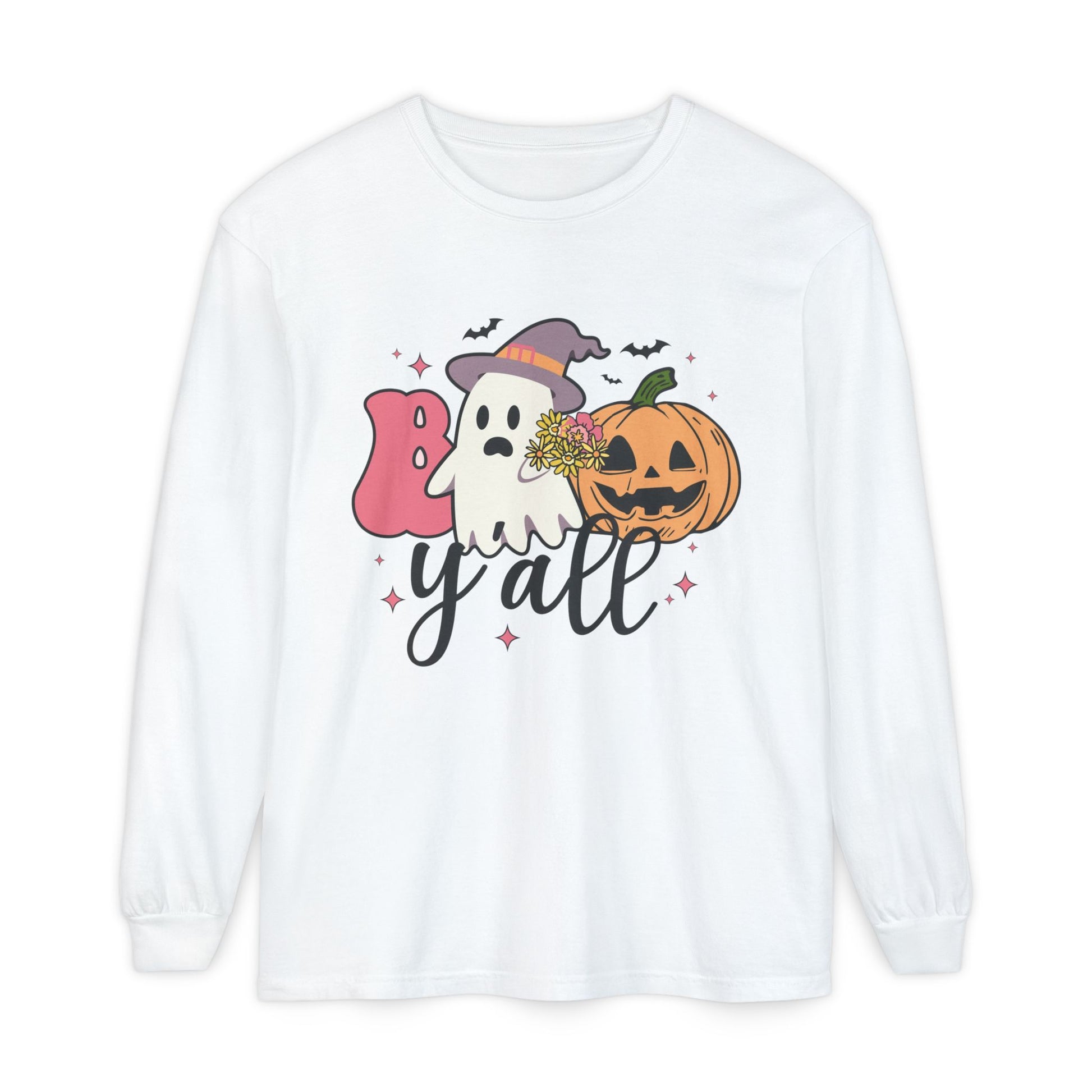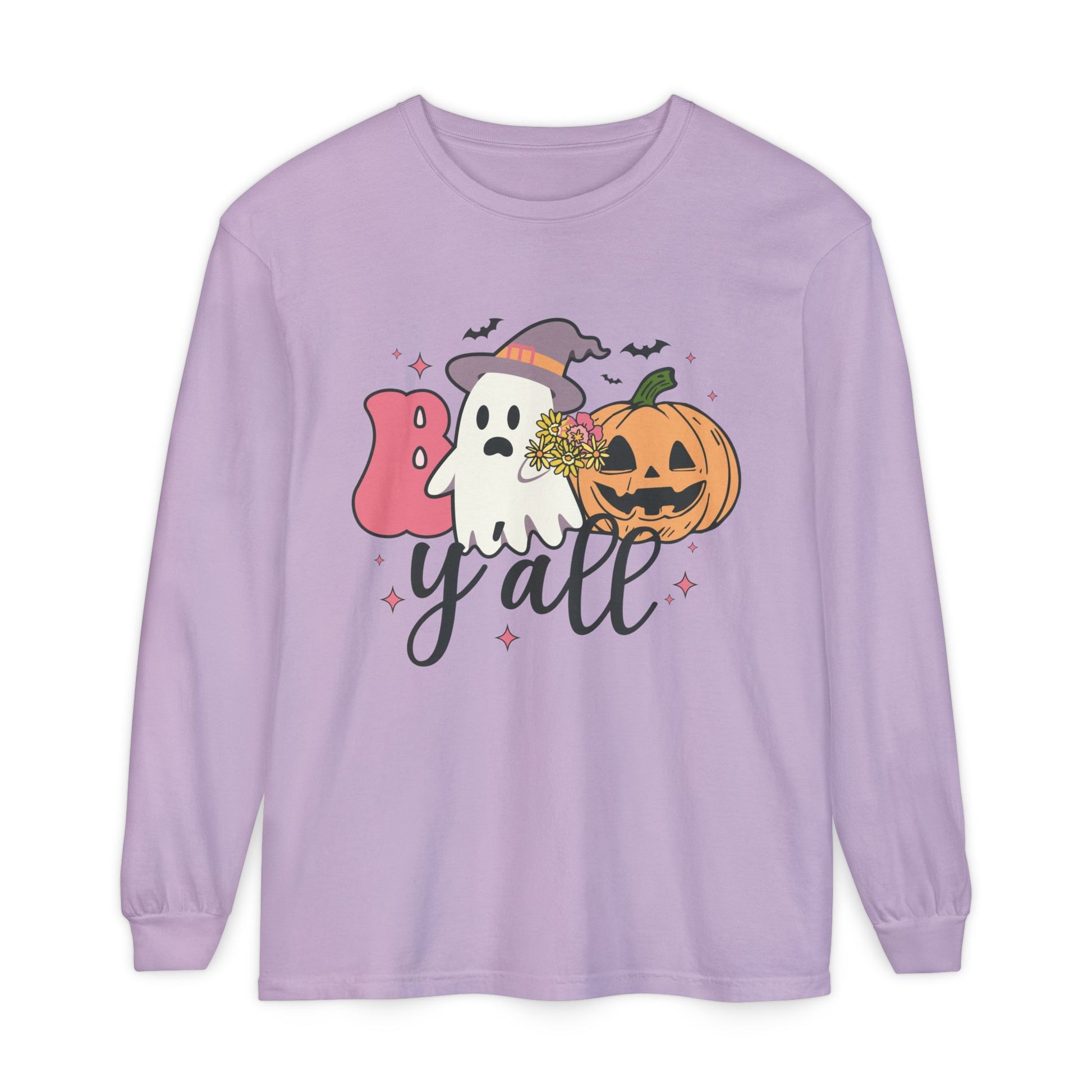 BOO Y'all Halloween Long Sleeve Tee, Cozy Fall Shirt, Unisex Ghost T-Shirt, Pumpkin Graphic Top, Perfect for Halloween Parties