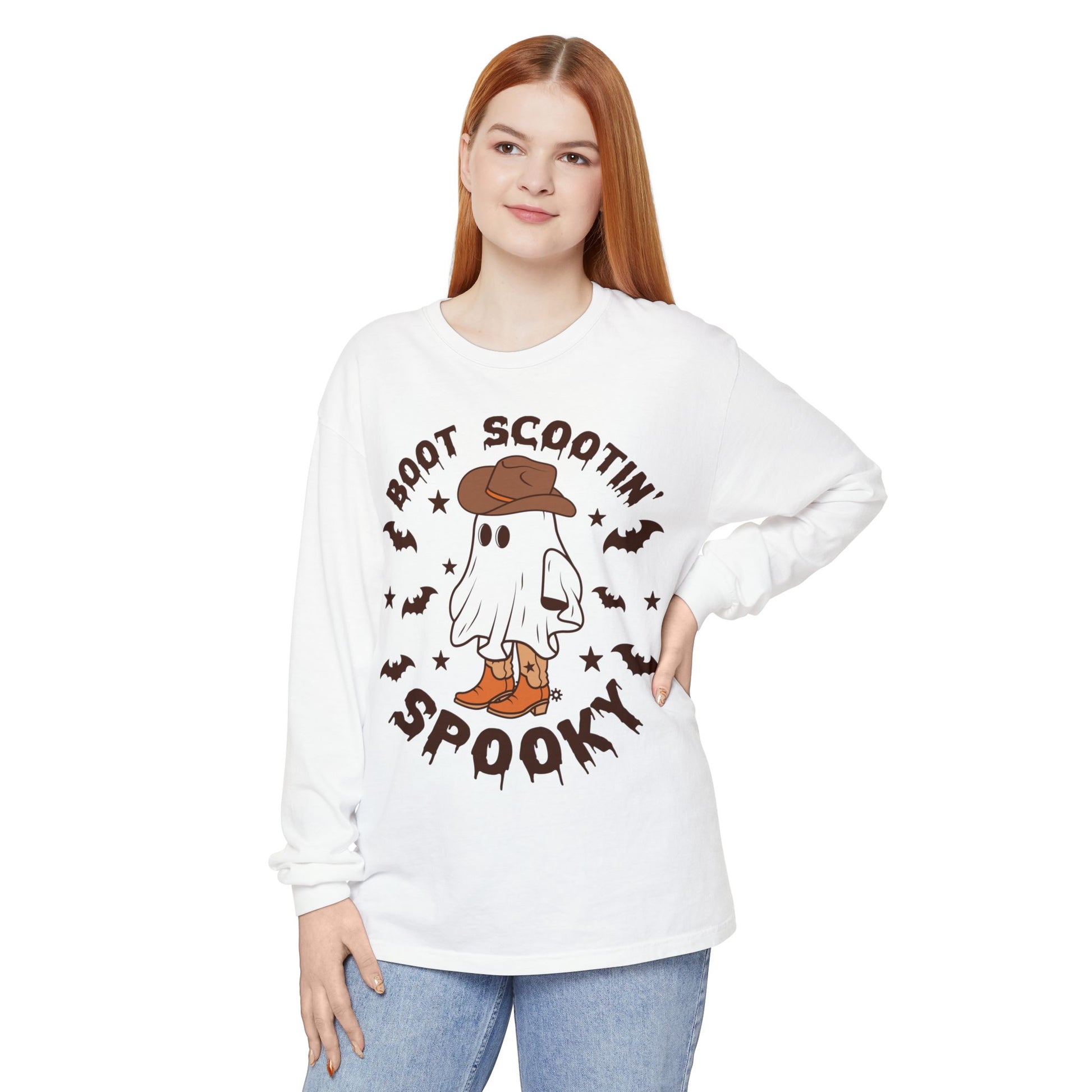 Boot Scootin Spooky Ghost Long Sleeve T-Shirt, Halloween Apparel, Unisex Tee, Fall Fashion, Casual Comfort Wear, Ghostly Fun